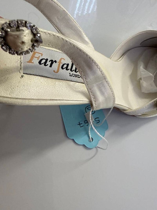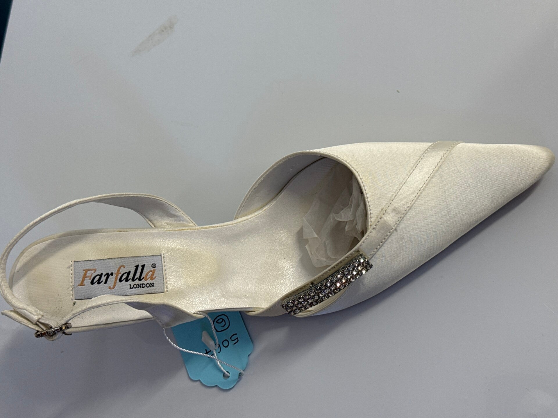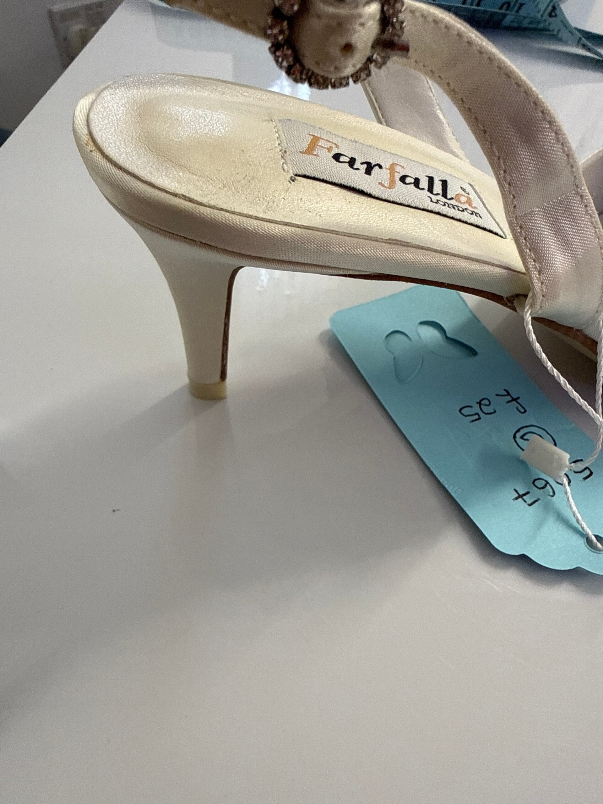 Ivory satin sling back kitten heel shoe, with beautiful embellishments.