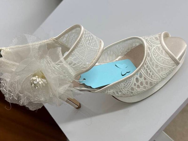 Ivory Lace & satin platform sandal with stiletto heel , detachable flower clip.