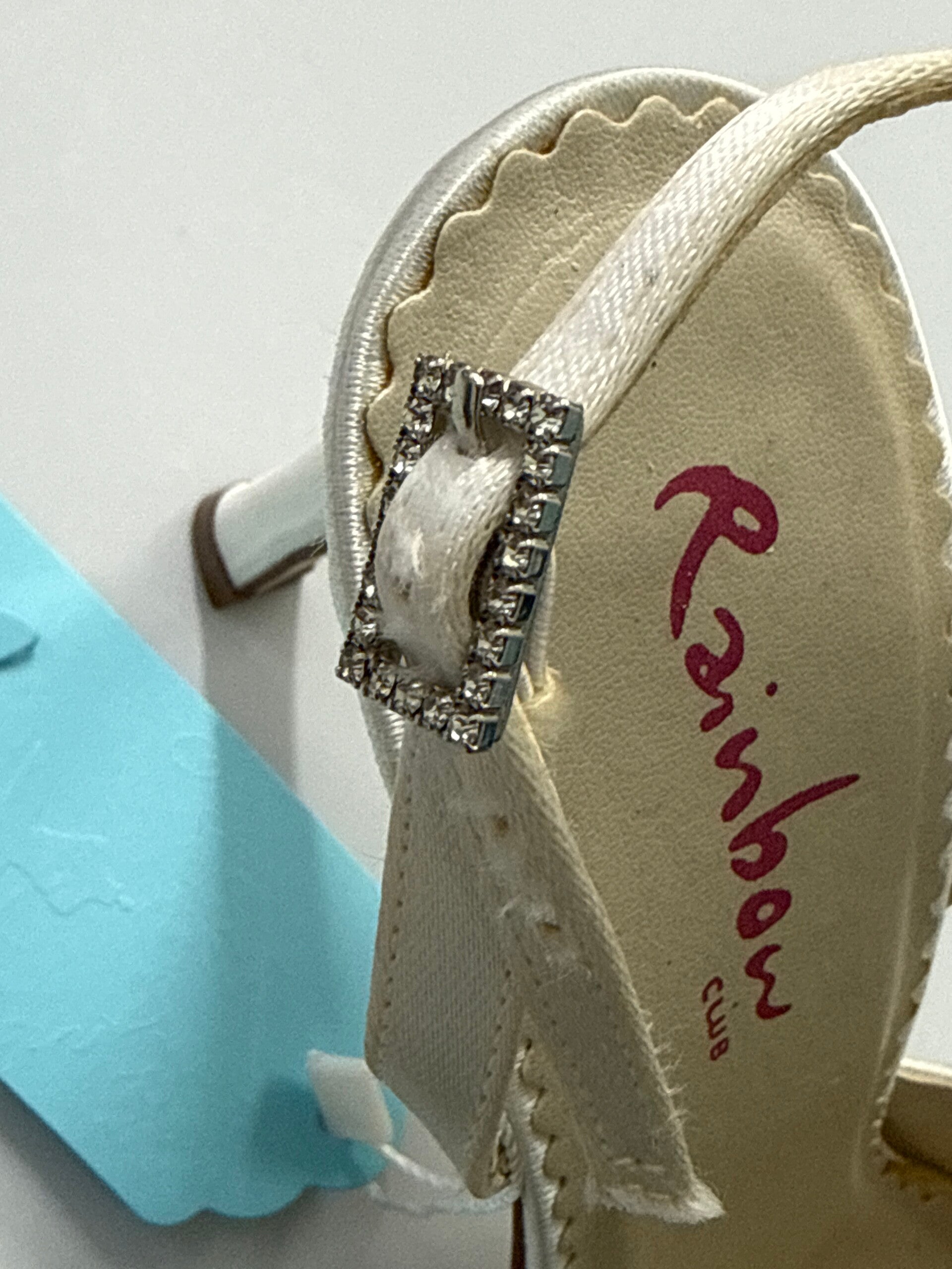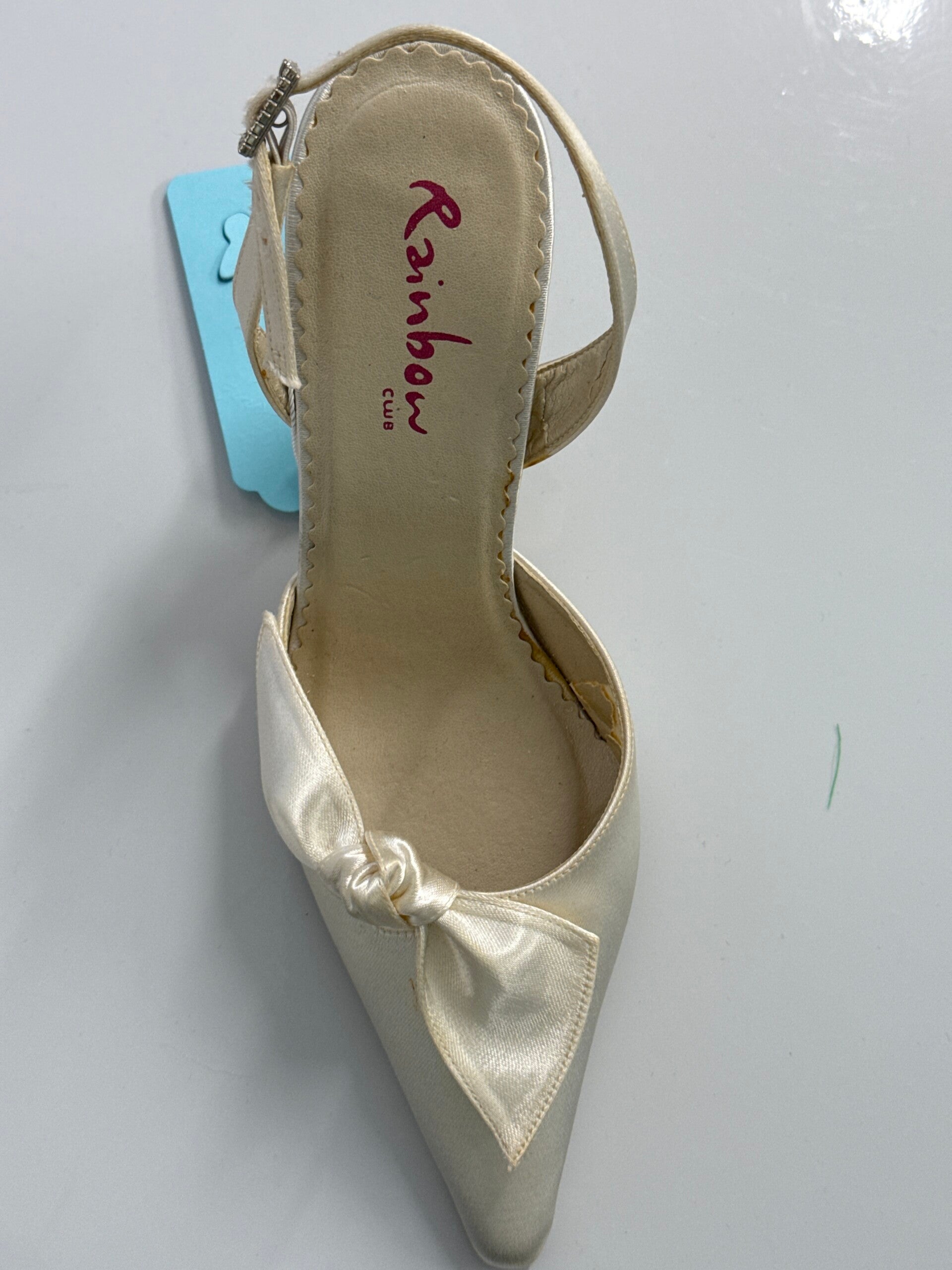 Ivory satin court shoe with bow detail and delicate crystals to the clasp.