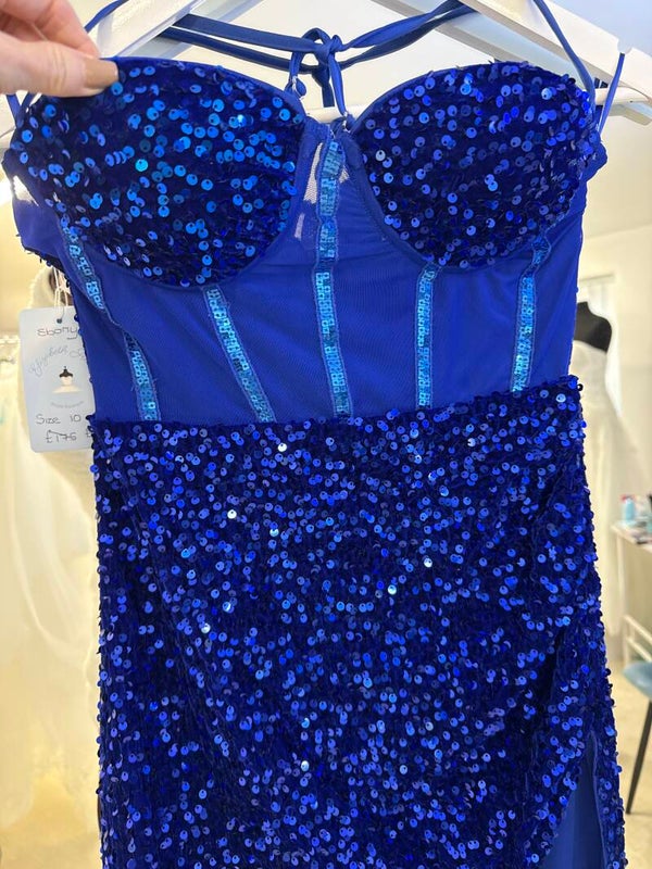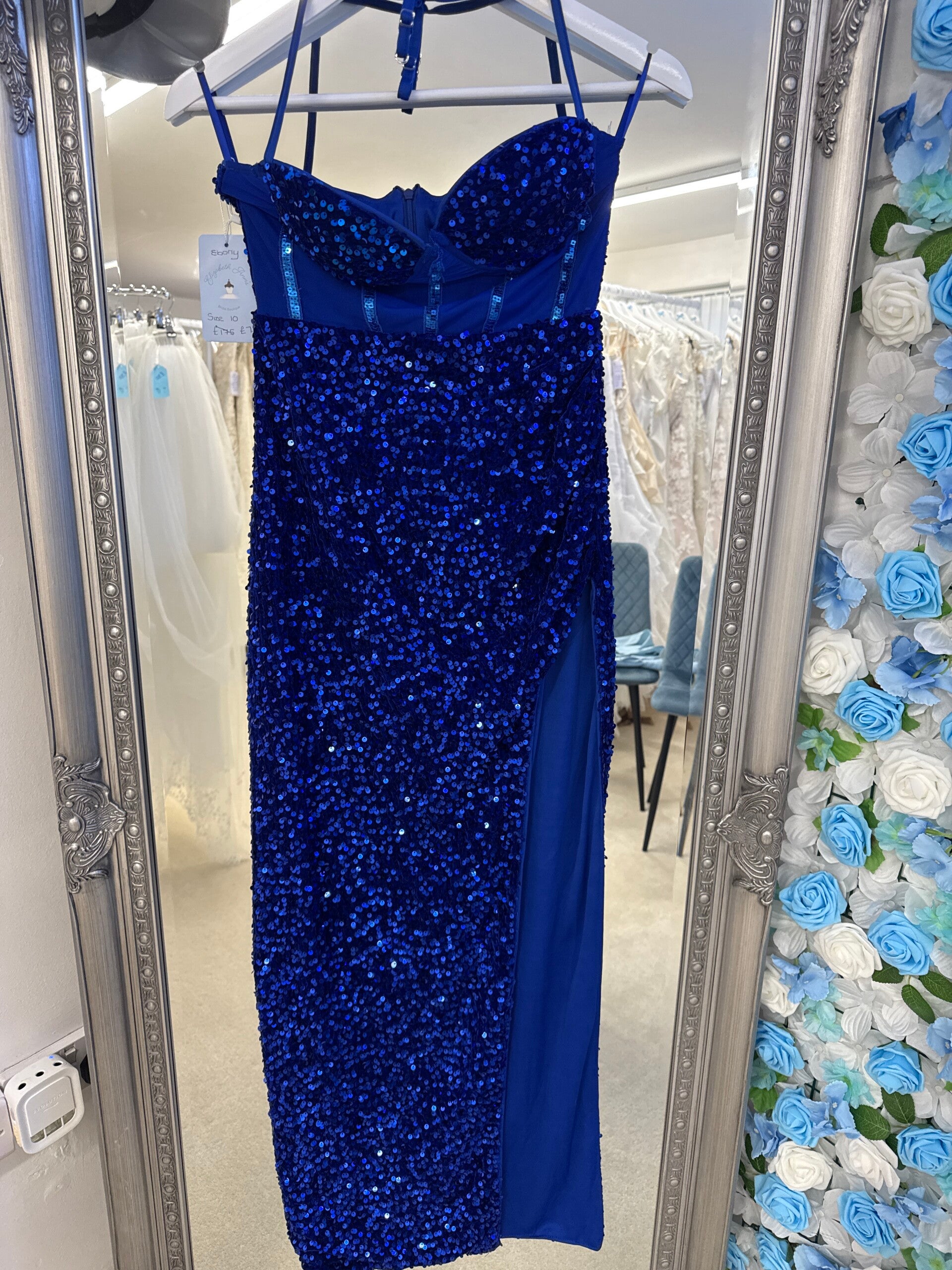 Royal blue bodycon sequin dress, split thigh and mesh bodice.