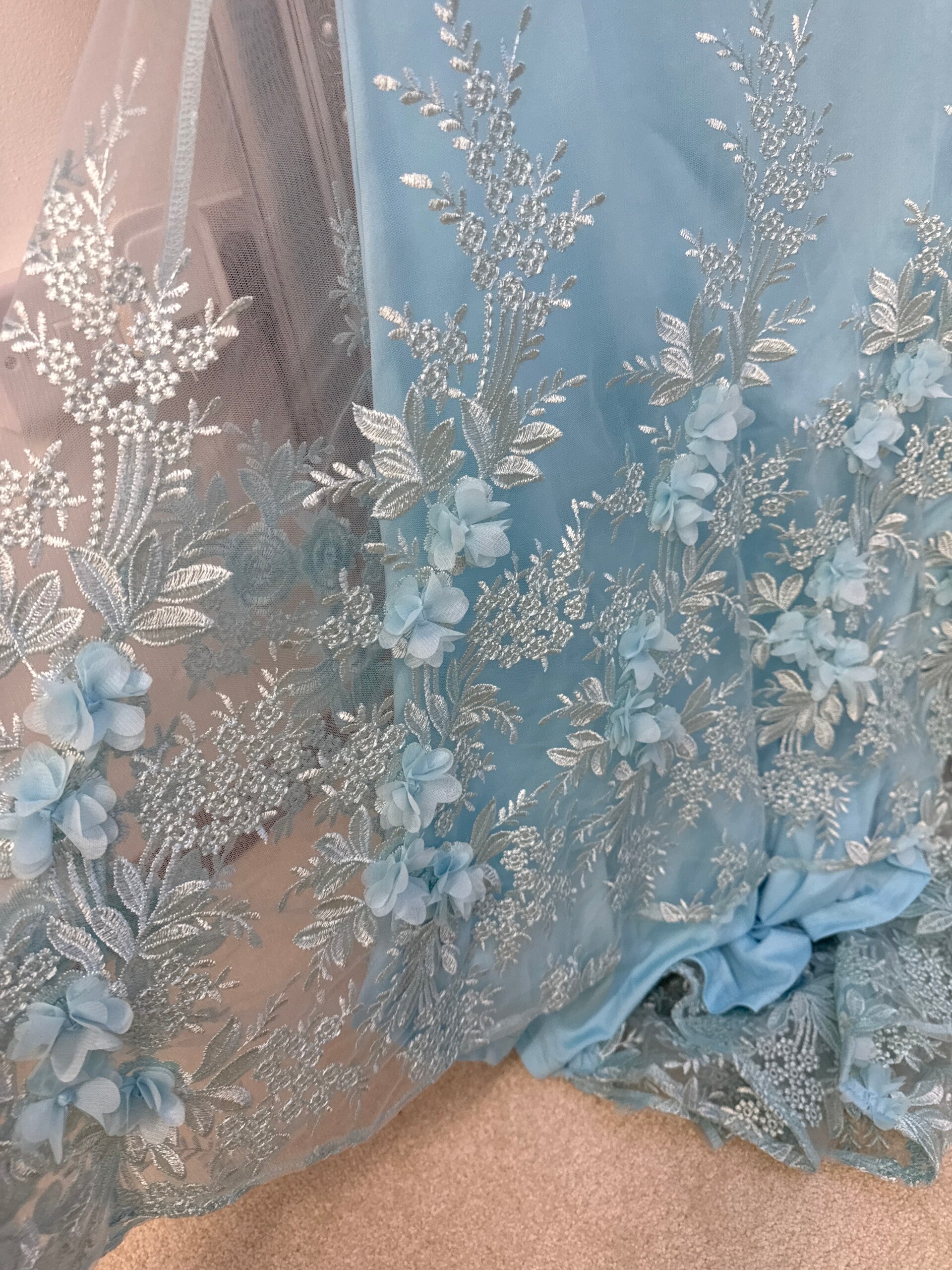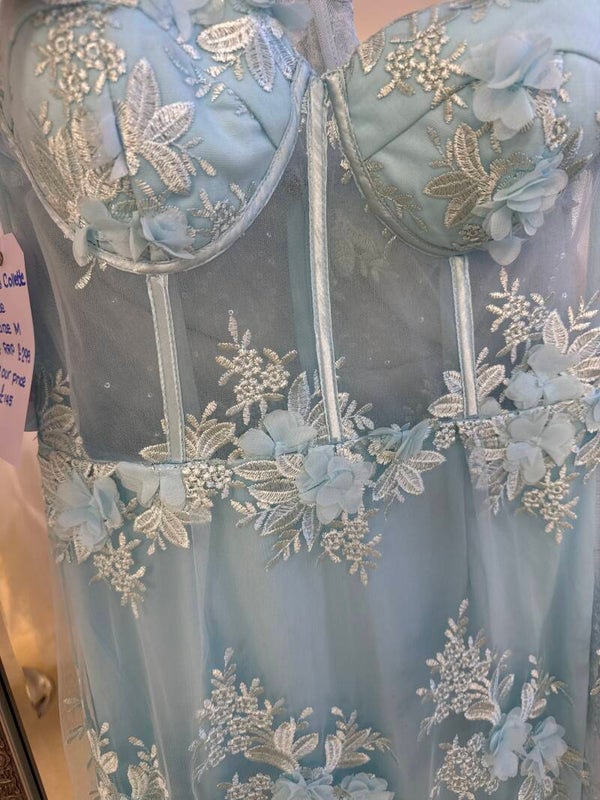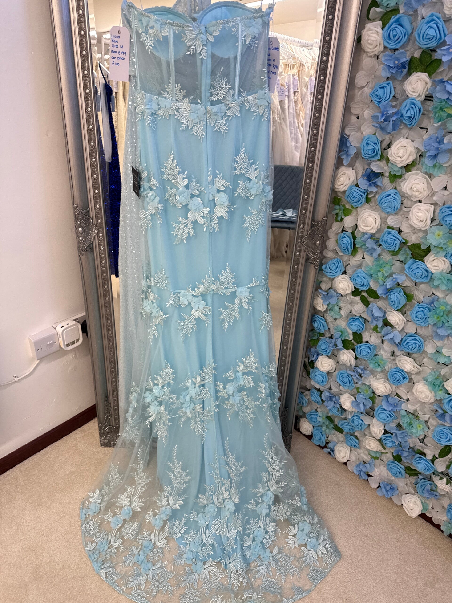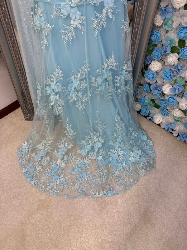 Strapless Blue mermaid dress with 3d floral appliqué and boned corset top& built in cups.
