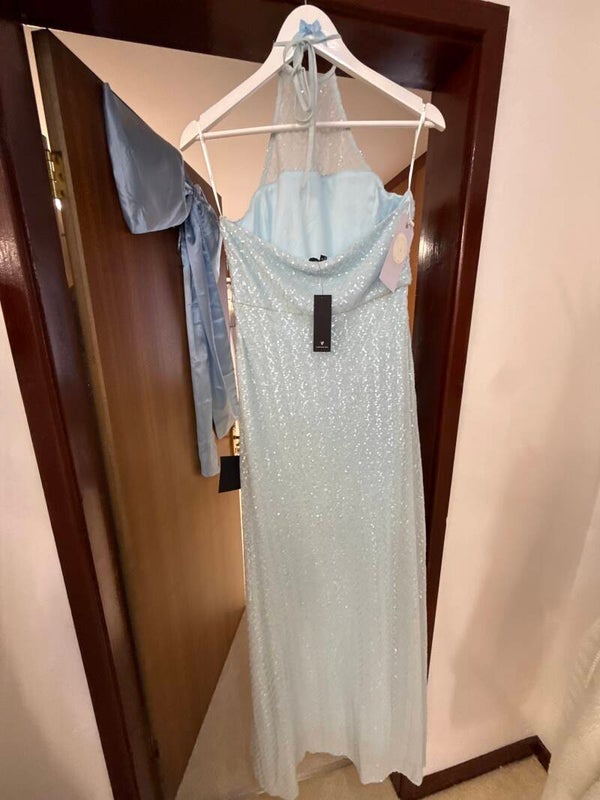 Pale blue halter neck A-line dress, with sequin detailing all over.