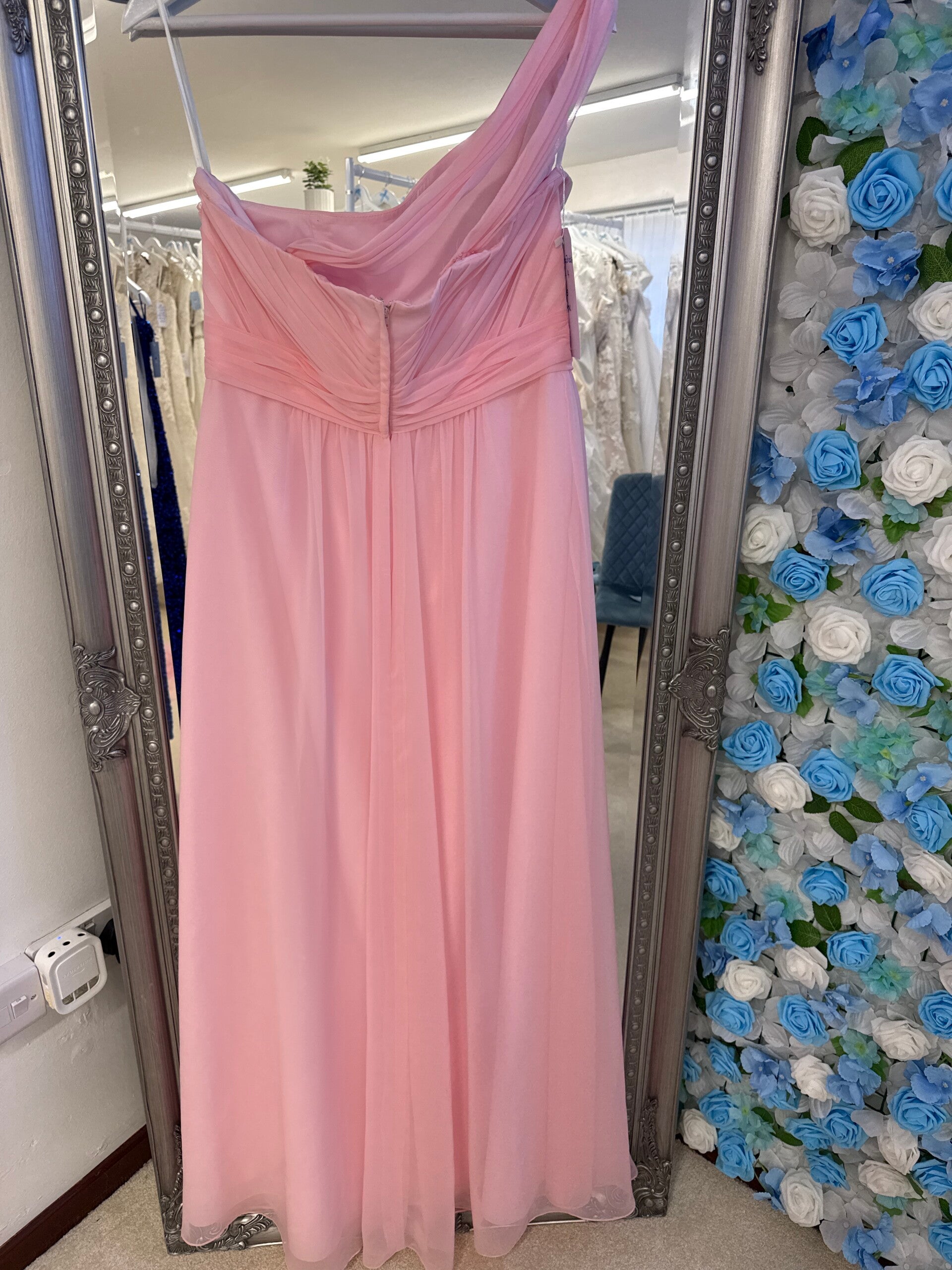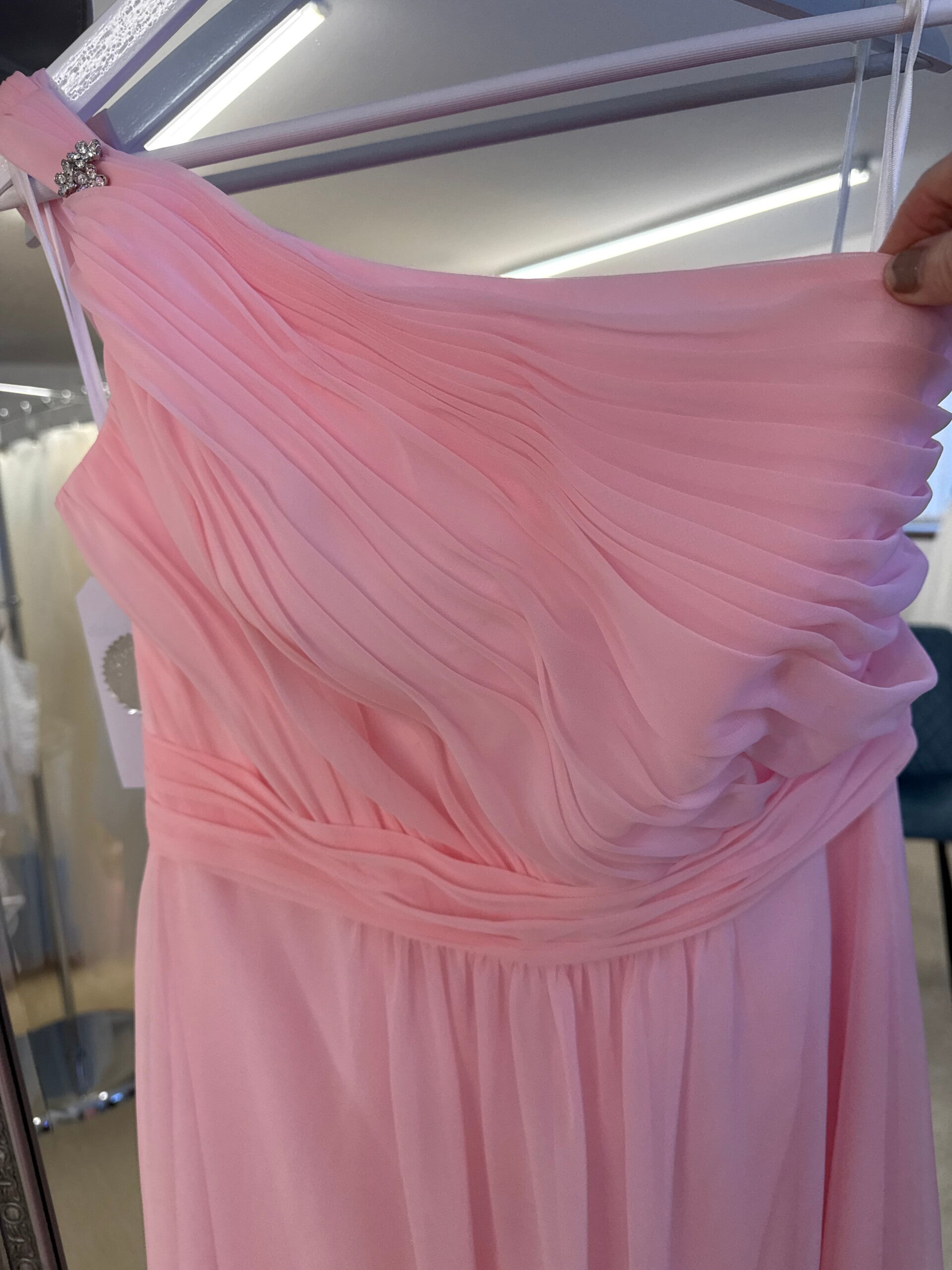 Baby pink chiffon A-Line dress, with ruched bodice and waistband.