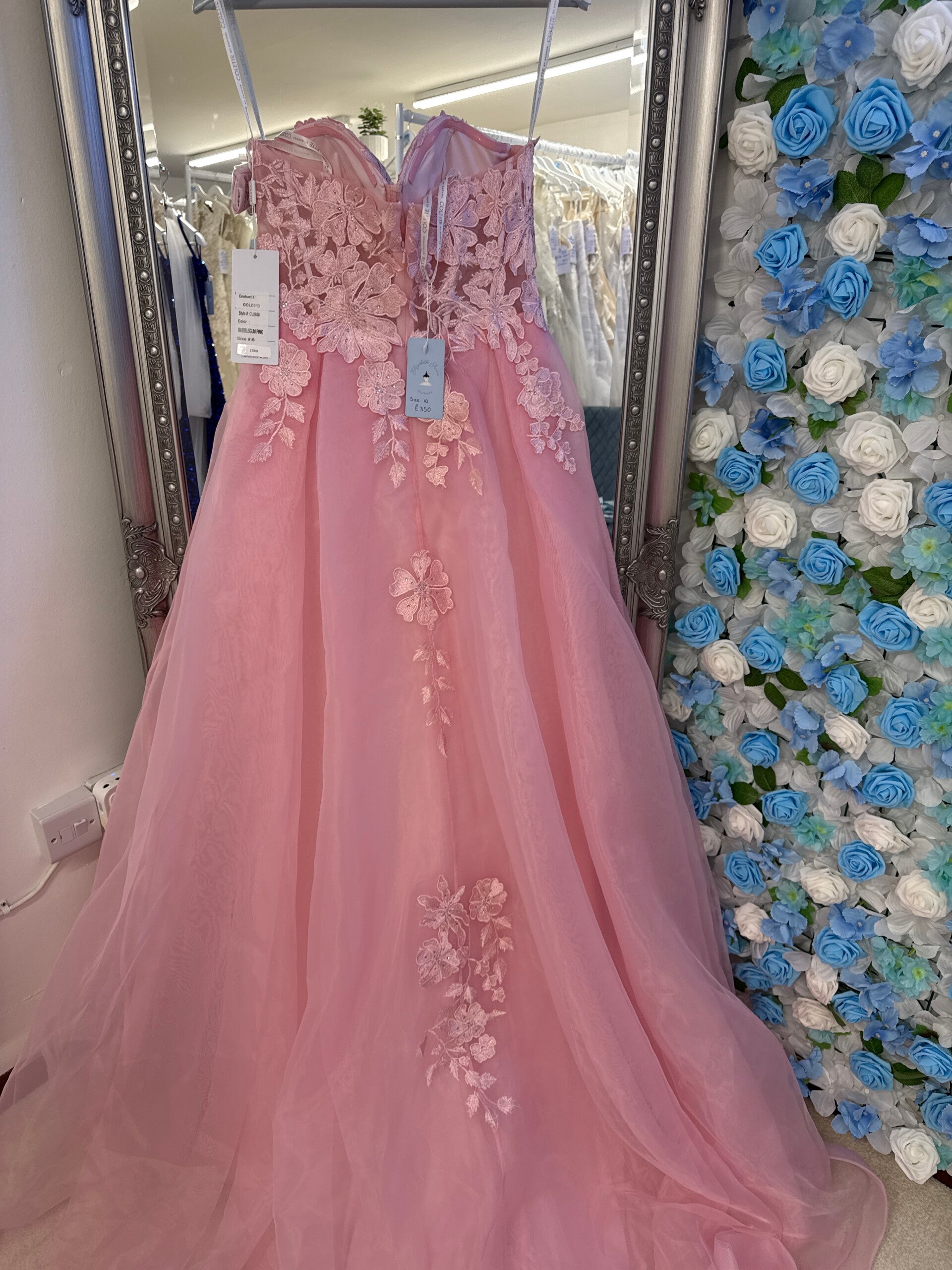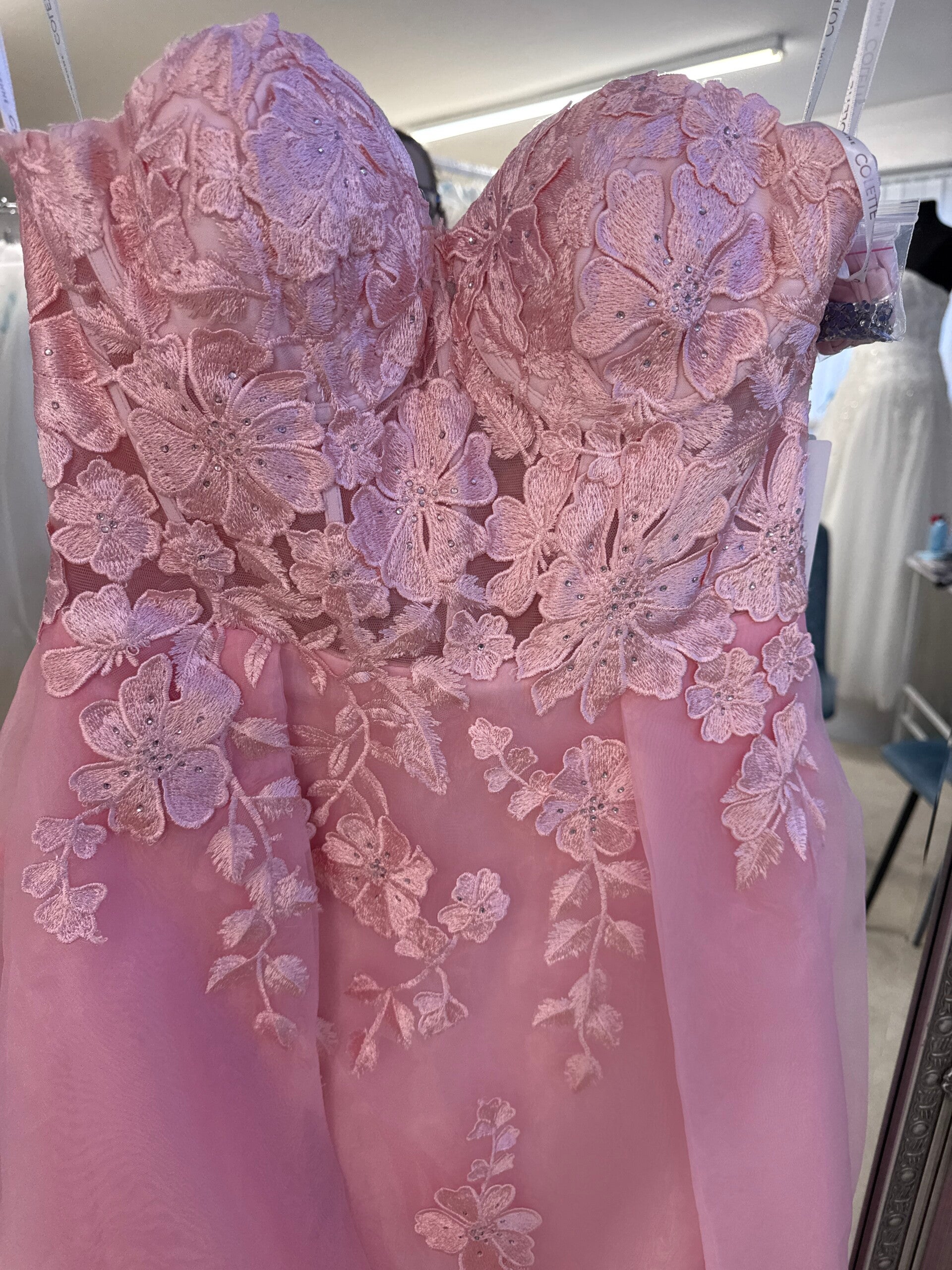 boned bodice with padded cups and appliqué floral detailing to the bodice with a delicate touch of diamantés.