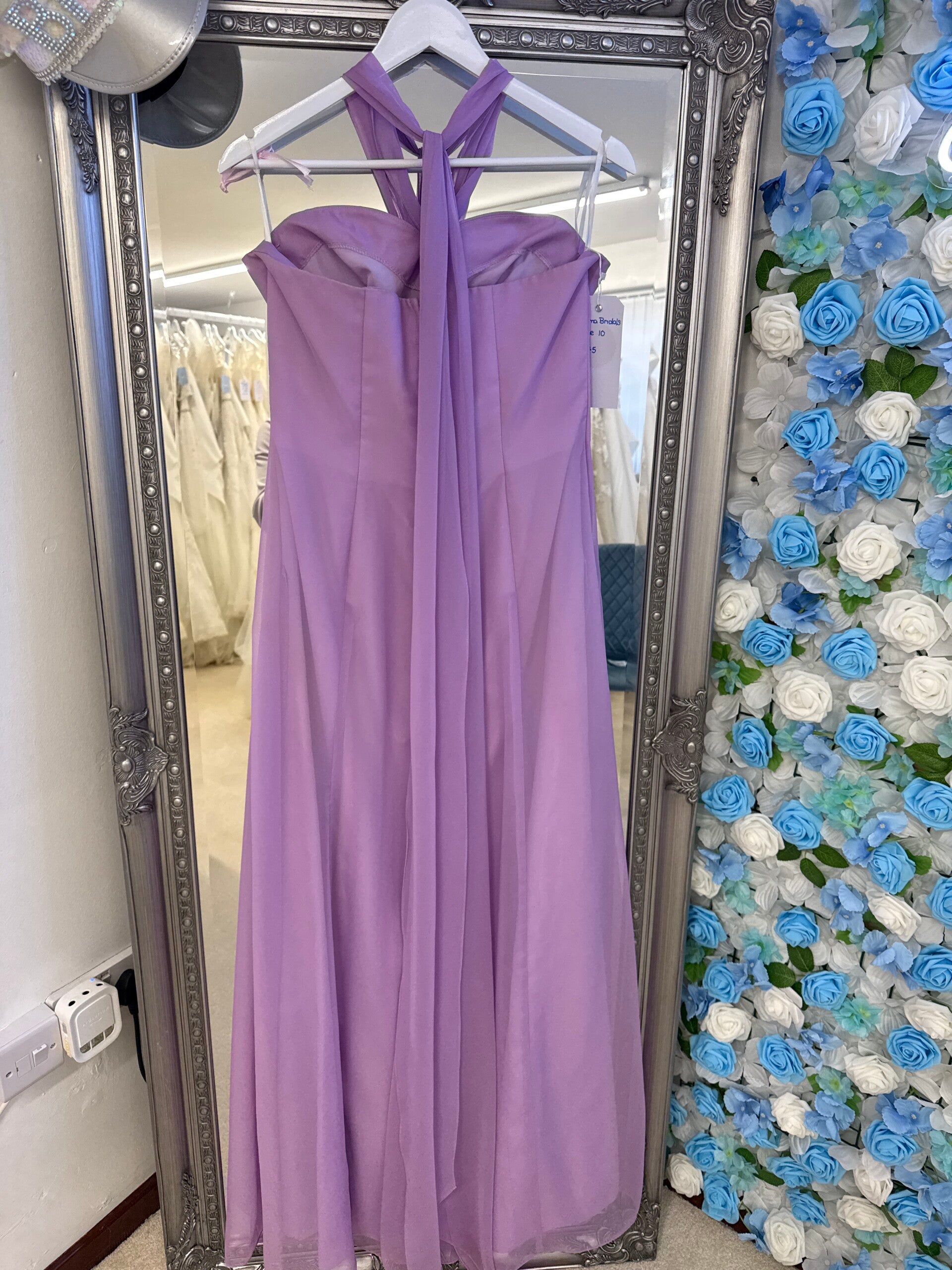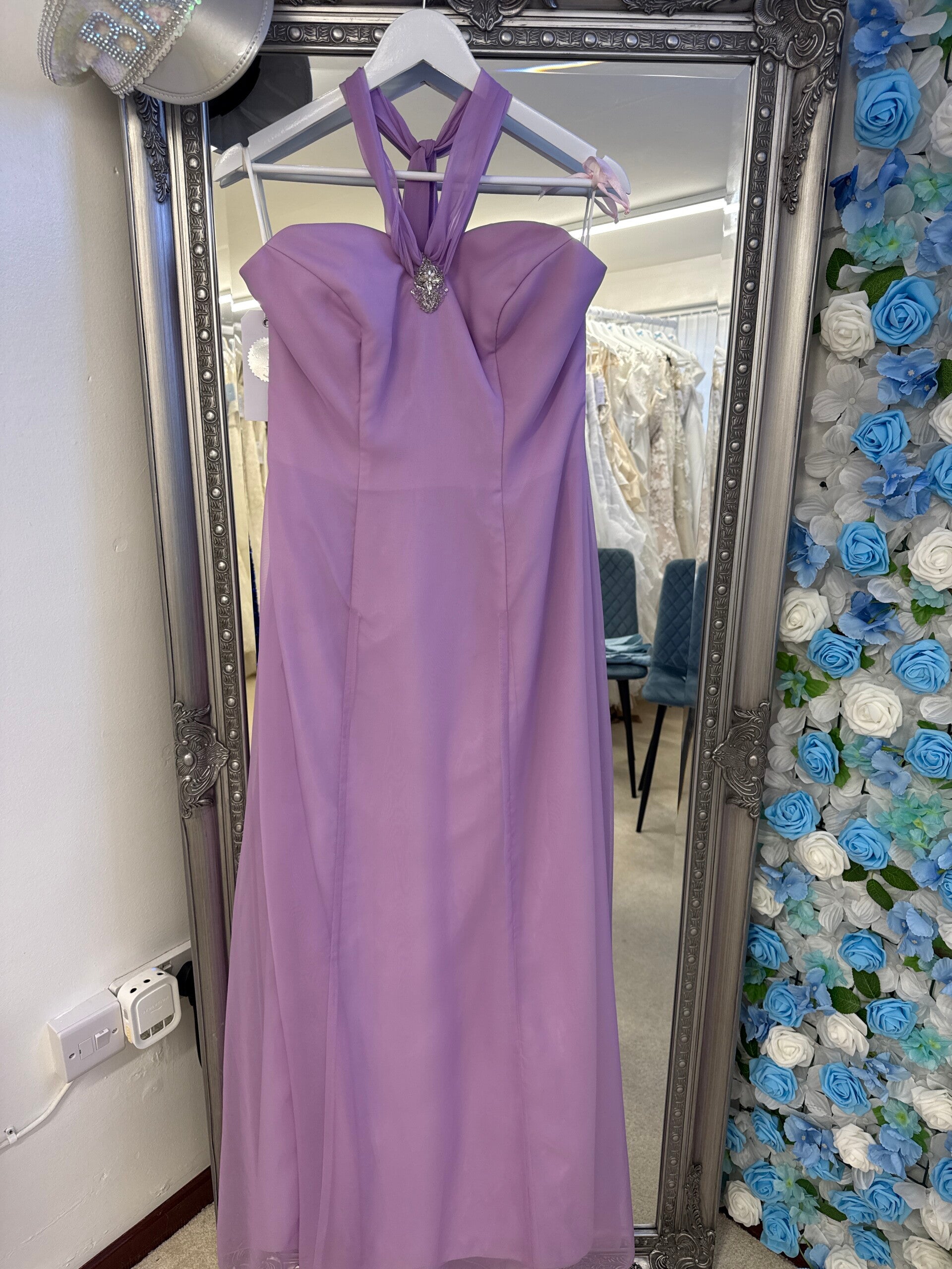 Wisteria chiffon fit & flare dress with scarf type halter neck with diamanté 3d to the sweetheart neckline.