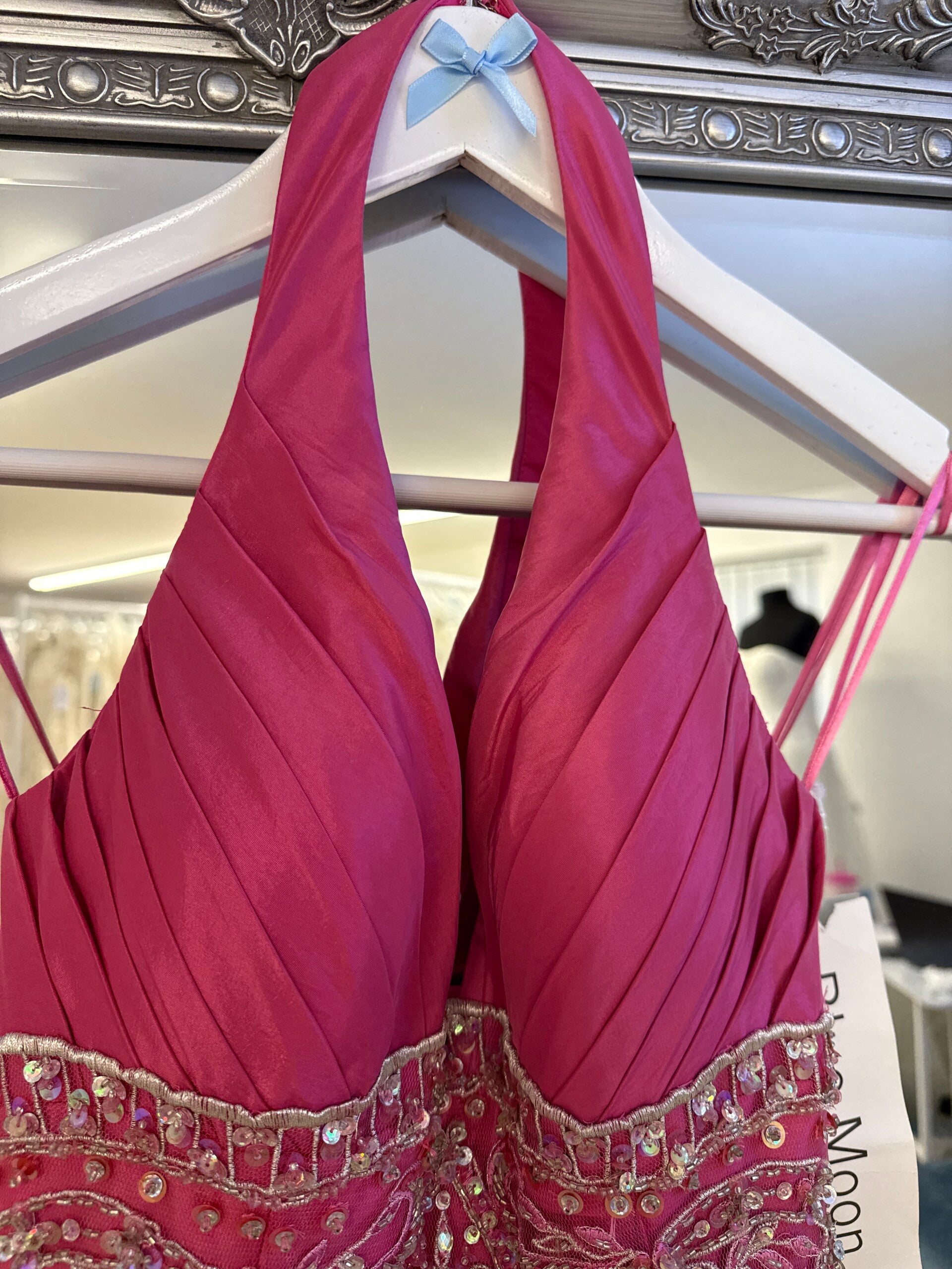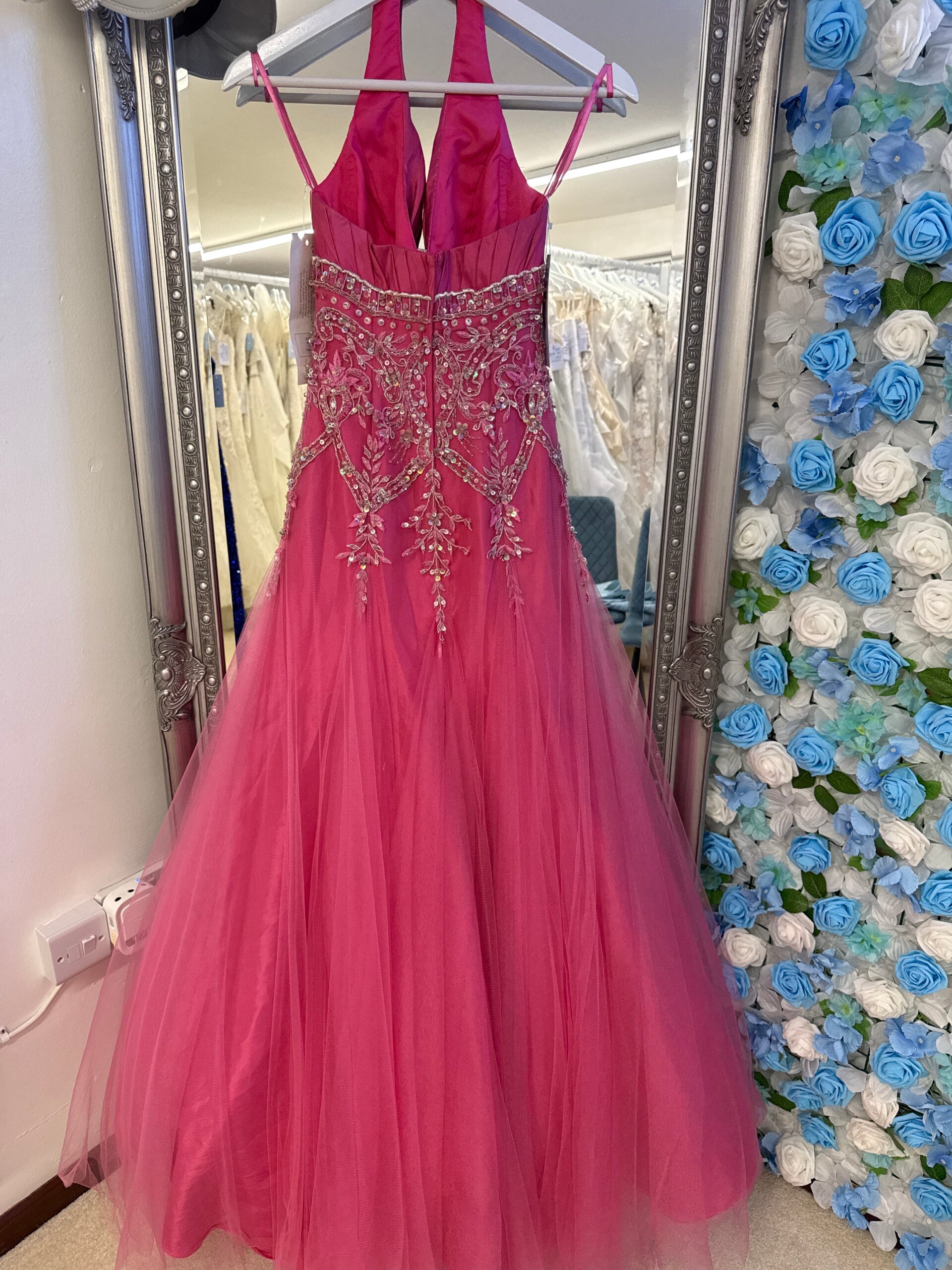 Hot pink satin & tulle fishtail dress, with halter neck and 3d embellishment to the middle of the dress, pleated bust area with built in cups.