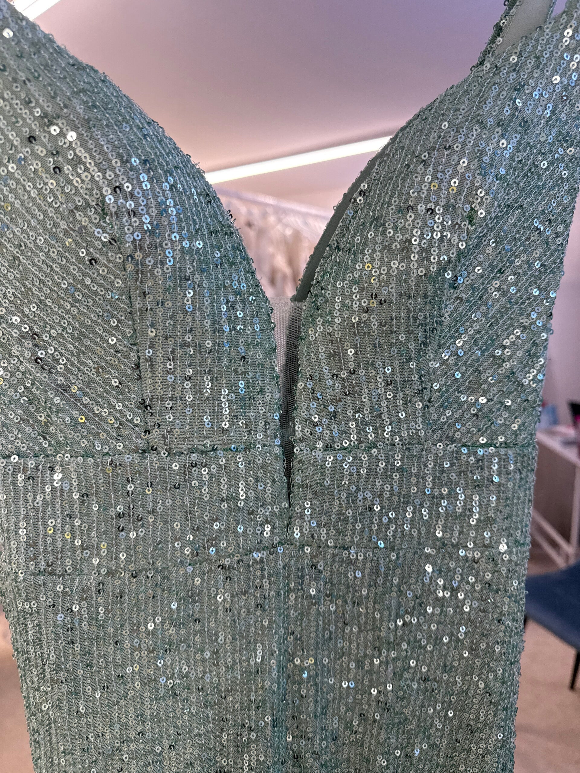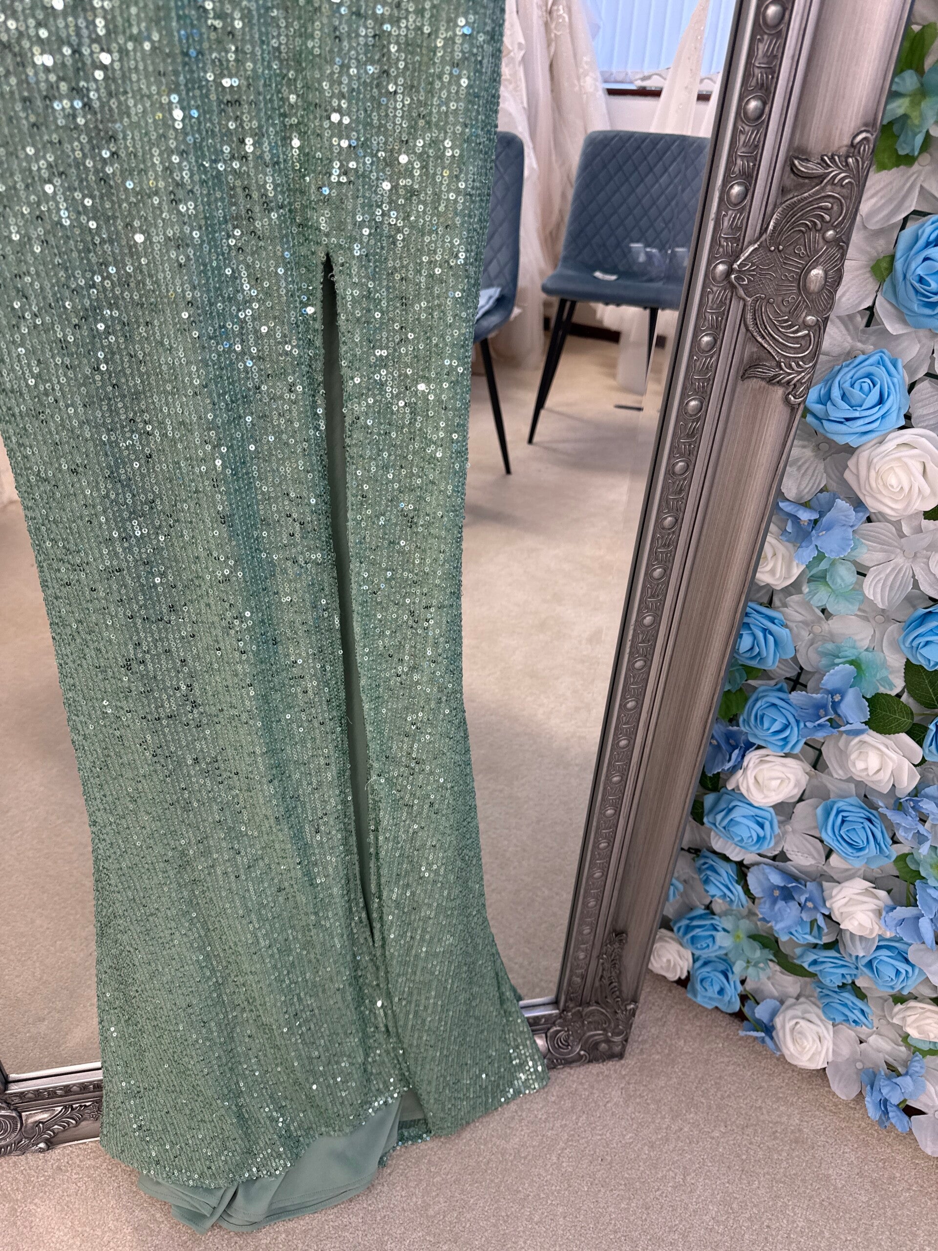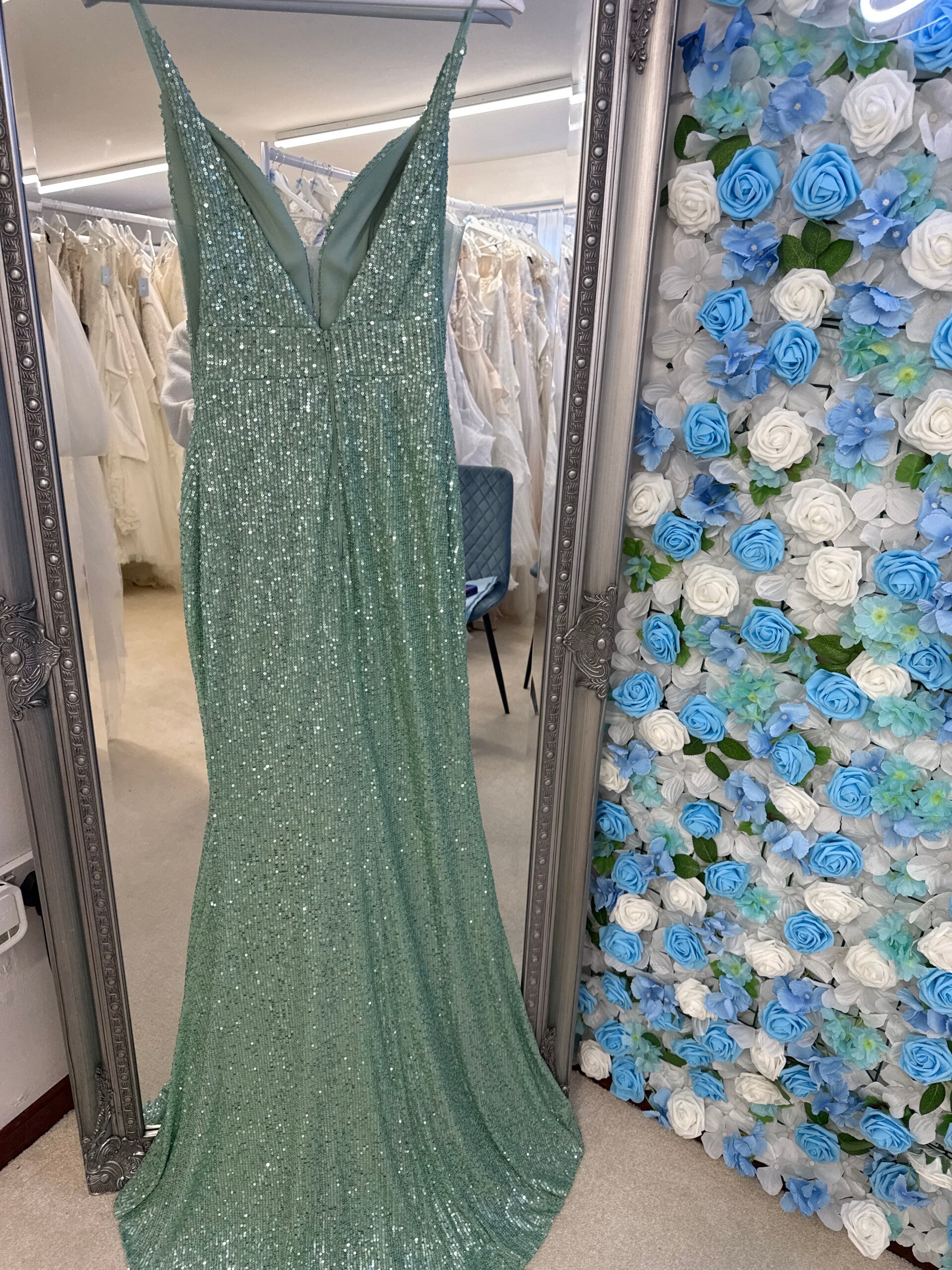 Fishtail sequin dress, with cut out mesh sides and a split to the thigh.