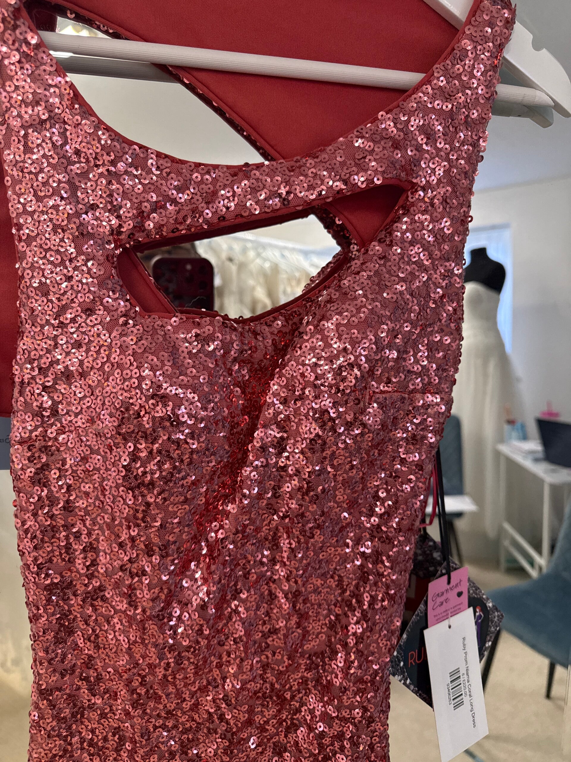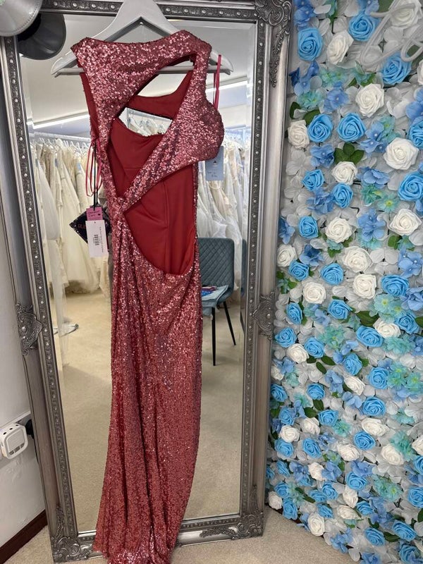 Coral sequin column dress with small train.