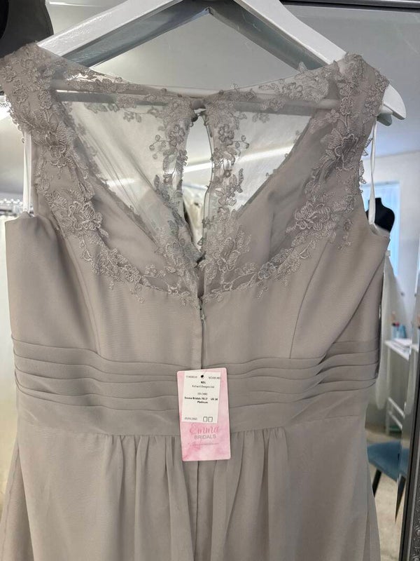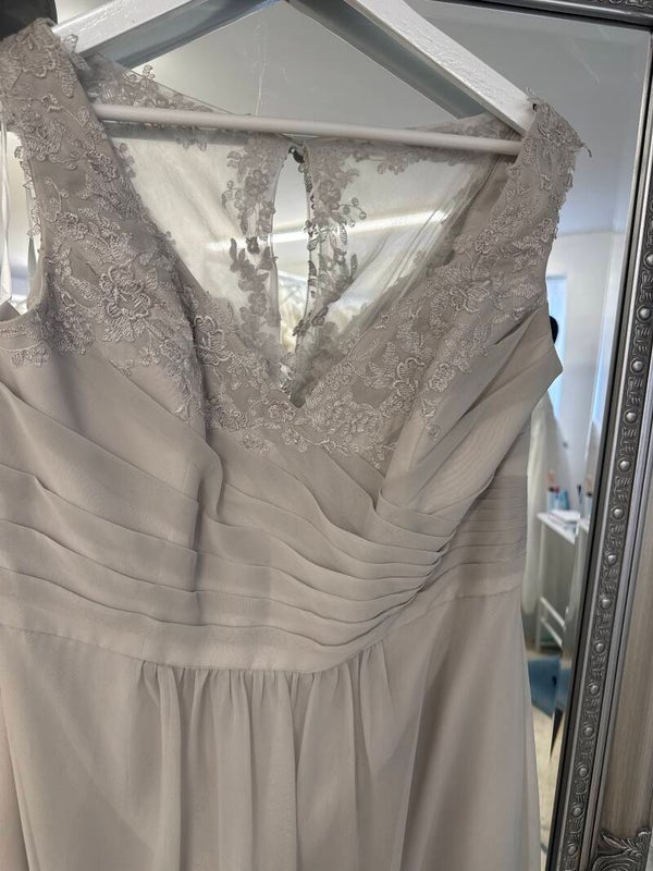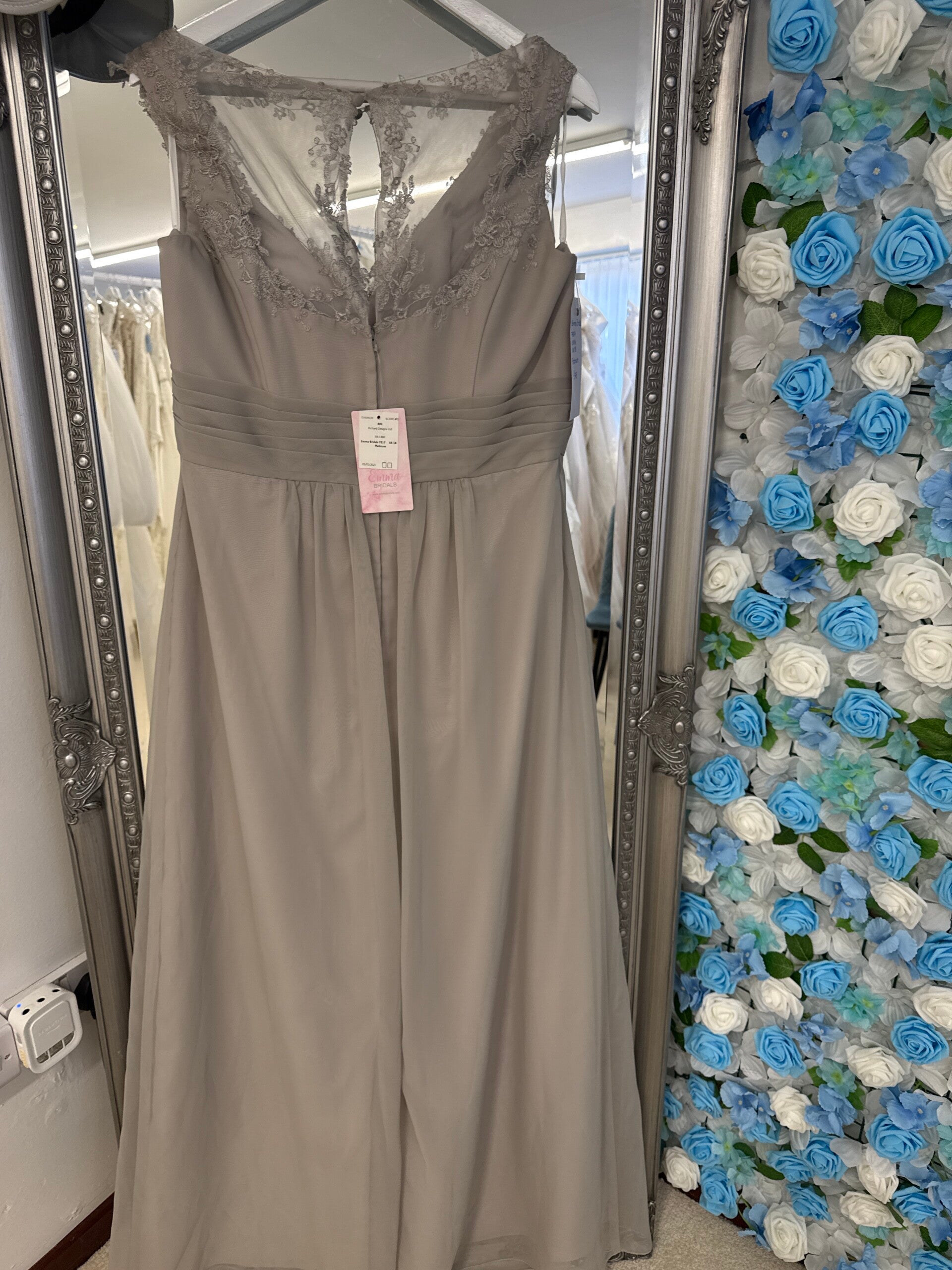 A-line chiffon dress with lace detailing to the straps ,mesh back with lace appliqué. V neck ruching around the bodice & waist.