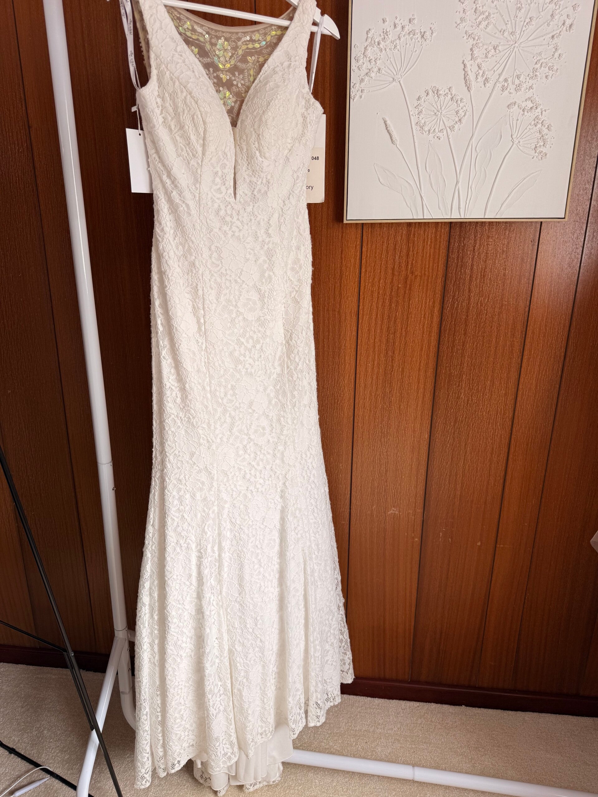 Boho-glam, sheath intricate lace floral overlay with sheer illusion panel( nude mesh) heavily embellished with irredescent sequins, crystals & beadwork in a baroque pattern. Deep v neckline with mesh insert for support, full coverage illusion design to the back.
